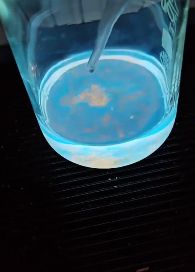 clear liquid being poured from an unidentified container into a glass beaker containing a bright blue liquid
