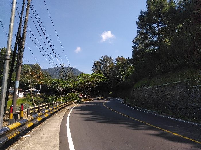 The image depicts an outdoor scene in the city of Hønefoss, Norway, on a clear, sunny day. The primary subject is an asphalt road curving from the lower center-left towards the mid-right. The road is marked with a solid white line on its left edge and a double solid yellow line, indicating a no-passing zone, near its center. To the left of the road, a concrete sidewalk abuts a black and yellow striped metal guardrail. Further left, two utility poles, one light grey and one darker, stand prominently, supporting numerous overhead power lines or communication cables that stretch across the upper left quadrant. Beyond the guardrail, a cultivated area with visible soil and rows of low-lying vegetation is present. In the mid-distance on the left, a small white building with a blue section on its roof is partially visible, with what appears to be a white bus or large van parked nearby. To the right of the road, a steep, heavily vegetated embankment rises, featuring a stone retaining wall at its base. Sections of this wall are topped with green netting or fencing. The embankment is covered in dense, dark green foliage, including tall evergreen trees on the upper right. In the background, rolling hills or mountains covered in lush, dense green forest dominate the horizon under a bright blue sky with two distinct white cumulus clouds. No people or active vehicles are visible in the scene.