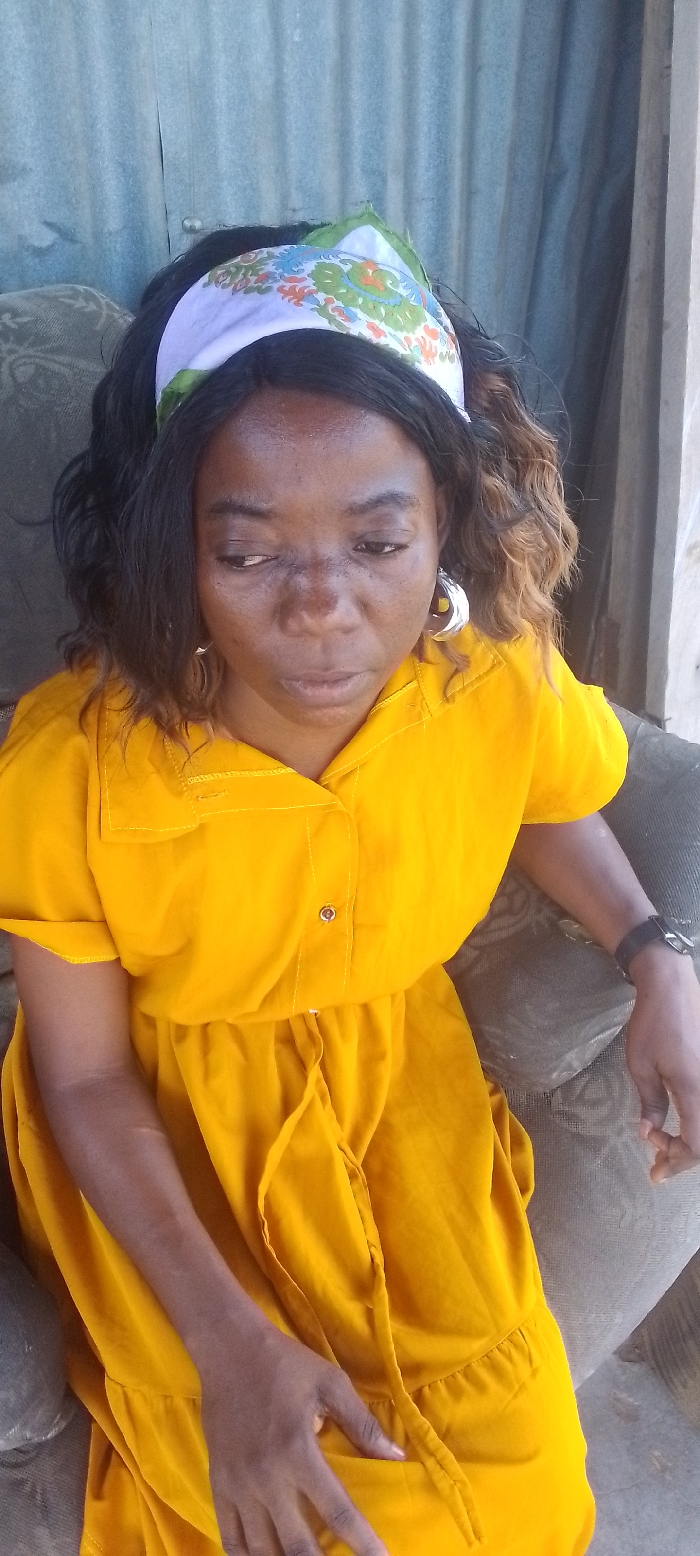 In Zango-ndaji, Nigeria, a single adult female is seated, observed from the chest up, with her head and upper torso angled slightly towards her right