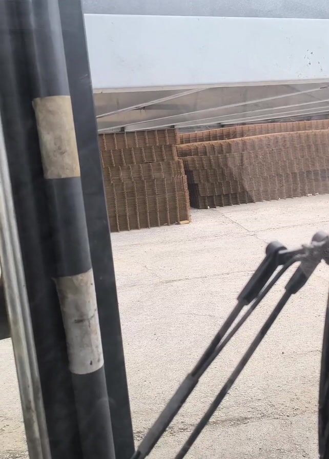 view from inside a forklift or similar vehicle, moving slowly across a concrete yard. Stacks of flat brown corrugated sheets and stacks of gray wire mesh are visible. A white box with text including "panel" is also visible. The gray and white roof or awning of a building covers the yard. The camera pans slightly left to right.