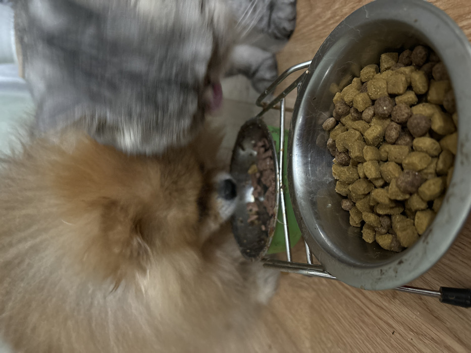 - "The image depicts two domestic animals, a light brown fluffy dog (likely a Pomeranian) and a grey tabby cat, actively feeding from a shared elevated metal bowl containing wet, chunky pet food" by FM-DSCl32, licensed under CC BY 4.0