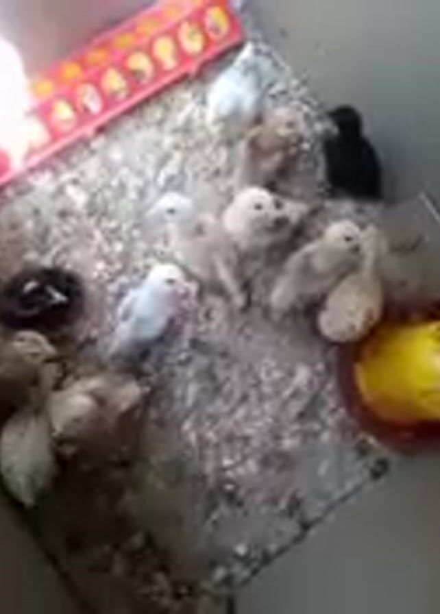 small, enclosed space with several baby chicks inside. The chicks are of various colors, including white, tan, and black. They are moving around on a bedding of what appears to be wood shavings. There is a yellow water feeder in the lower right corner and a red feeding trough along the top of the enclosure. The overall lighting is slightly dim.