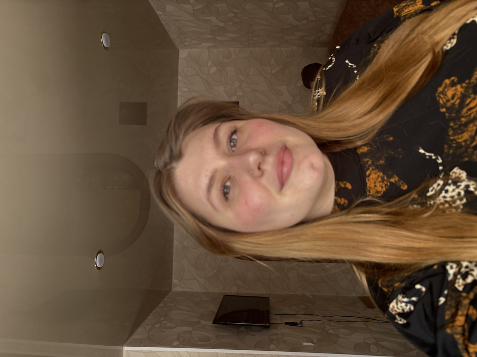 The image displays an indoor scene focused on a woman in the foreground. The woman has light brown hair, blue eyes, a faint smile, and a small stud piercing on her left nostril. She is wearing a black long-sleeved turtleneck shirt patterned with irregular orange, brown, and cream shapes. The background shows a room with light brown walls adorned with patterned wallpaper featuring swirling, interconnected lines. On the left wall, a dark flat-screen television is mounted, with black power and data cables extending downwards. The ceiling is a reflective, light brown surface, showing distorted reflections of the room's elements, including parts of the primary subject's head. Two circular recessed lights with white centers and metallic rims are visible in the ceiling. In the lower right background, a second individual is partially visible from behind, seated on a dark brown upholstered surface. Only the back of their head, with short dark hair, and a portion of their dark clothing are discernible. The specific location within Chaikovsky, Russia, cannot be identified from the visual information presented.