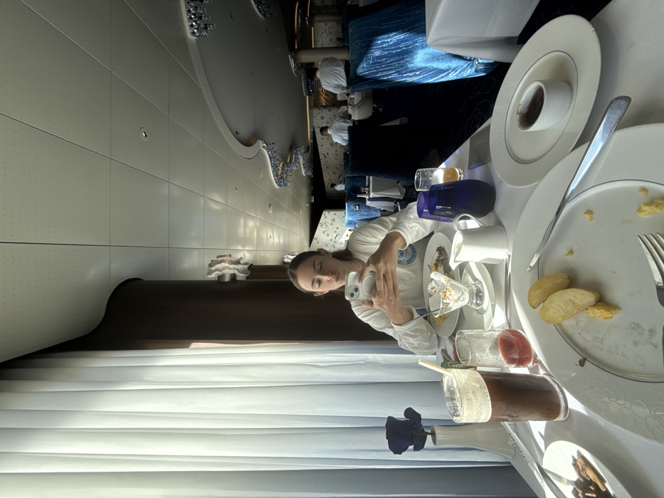 The image depicts a contemporary dining room scene in a restaurant located in the city of Rum Cay, Bahamas. In the foreground, a young Caucasian female with light brown hair is seated at a white-clothed table, facing slightly right. She wears a white long-sleeved shirt with a small emblem on the chest and is actively holding and looking at a white smartphone with both hands, her lips slightly pursed. On the table in front of her, a partially consumed meal is visible. To her immediate right, a white plate contains a clear glass dish with a dessert-like item, next to a larger dark food item. Further to the left on her table, a dark beverage in a tall glass with a straw, and a smaller glass with a reddish drink are present. Two dark blue tumblers and a clear glass with an orange beverage are also on the table. A small white pitcher stands between the glasses. To the far left, a dark blue decorative object, possibly a rose, is in a white vase. In the immediate foreground, a white plate shows remnants of a meal, including two potato wedges and scattered crumbs, with a fork and knife resting on it. To the right of this plate, a small white oval dish containing a dark sauce or condiment sits on another white plate. Further to the left, a plate with small, dark items is visible. The restaurant's interior features bright natural light entering from large windows on the left, filtered by sheer white vertical curtains. Dark brown structural pillars or wall panels are present. The ceiling is white and perforated, with recessed lighting. Architectural elements further into the room include curved white structures with ornate blue crystal or glass light fixtures hanging from them. In the background, multiple tables covered with white tablecloths are set with dark blue upholstered chairs. Several individuals, likely restaurant staff wearing white shirts, are visible moving or standing in the background. Other patrons are also seated further back in the dining area. The overall ambiance suggests an upscale dining establishment.