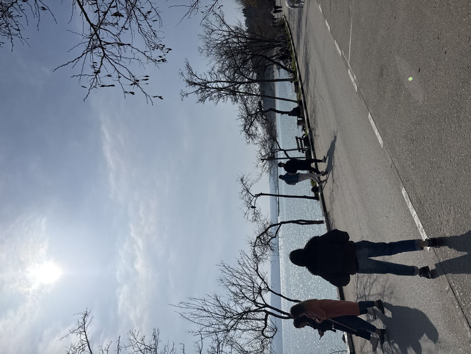 The image depicts a waterfront promenade in Varna, Bulgaria, likely along the Black Sea or Varna Bay, under bright daylight with a partially cloudy sky. The scene shows a paved asphalt road in the foreground, with a dashed white line marking its right edge. In the immediate center foreground, a person is seen from behind, standing on the road, wearing a dark jacket, blue jeans, and dark sneakers. To their left, nearer the water, three individuals are present: one wearing a light orange/peach jacket, another in a dark jacket, and a third partially obscured figure, all appearing to walk or converse. Further to the right in the midground, two males walk side-by-side on the paved path adjacent to the water, both dressed in dark clothing. In the distant right background, several other indistinct figures are visible on the path, one near a white, quadrupedal animal. A large body of light blue water, reflecting significant sunlight, occupies the left and central midground, extending to the horizon. Distant land formations or city structures, possibly industrial or port elements, are visible across the water on the far left horizon. Numerous bare-branched deciduous trees, some with visible seed pods, line the promenade between the paved path and the water, casting distinct shadows. Benches are intermittently placed along the path.