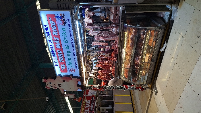 This image shows a butcher shop named "El Toro Más Rico" (The Richest Bull), owned by Johnny & Erika