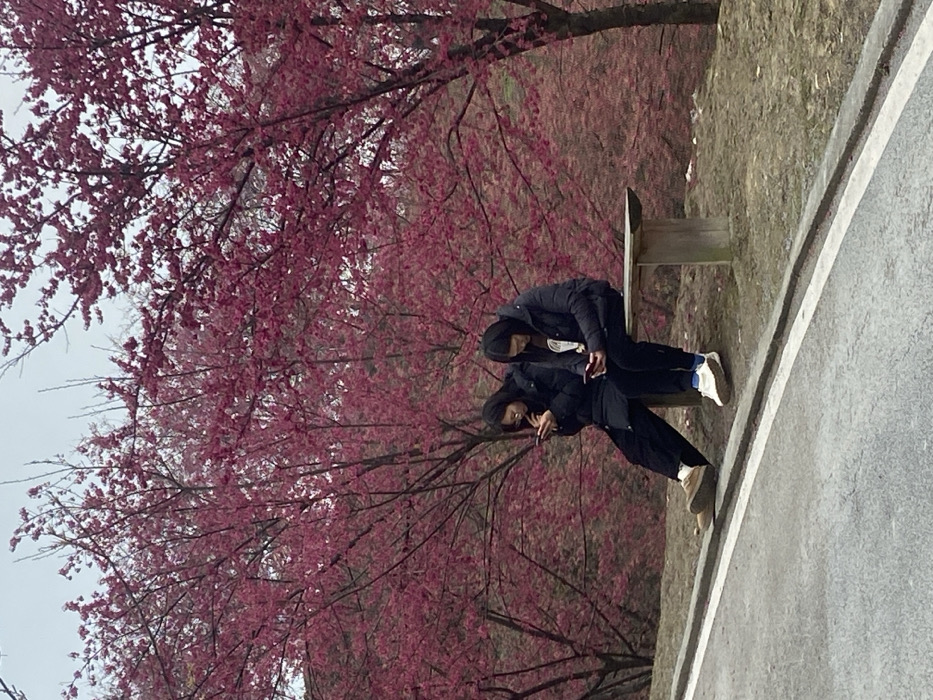 Two people sit on a park bench in front of a blossoming tree. The pair wears dark clothing. One person leans toward the other, who holds a phone. The scene is slightly tilted, showing a sidewalk and grassy area behind the bench and tree, filled with pink blossoms. The sky is overcast.