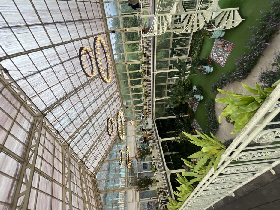A sideways view inside a bright greenhouse with a grid-patterned roof. Ornate, ring-shaped chandeliers hang from the ceiling. Below, a garden area features lush greenery, including ferns and flowering plants, interspersed with seating areas. A decorative rug lies on a patch of artificial turf. White railings line the pathway, with potted plants attached. The overall impression is of an elegant, inviting indoor garden space.