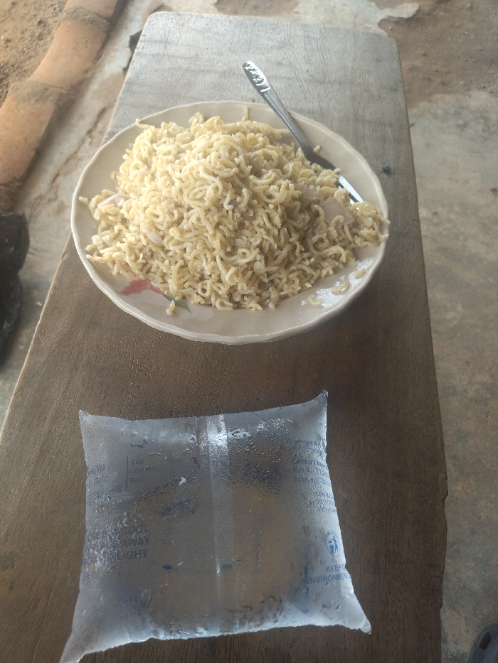 plate of noodles on a wooden table. The noodles are in a white plate, and there is a fork on the table to the left of the plate. There is also a clear plastic bag of water on the table to the right of the plate. The location of the photo is in Asuir, Nigeria. The coordinates are 7.685 latitude and 8.536 longitude.