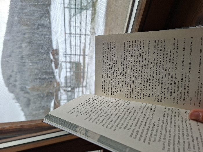 A human hand, visible in the lower right, holds an open book displaying Cyrillic text on its two visible pages