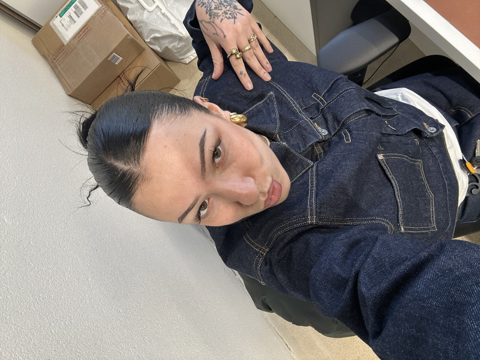 A female individual is depicted in a high-angle, mid-shot selfie, posing with pursed lips. She has dark hair styled in a tight bun with a visible middle part and several loose wisps. Her facial features include defined eyebrows, extended eyelashes, a nostril piercing, and light brown eyes. She is wearing a dark blue denim jacket with prominent yellow stitching over a white undergarment. Accessories include large gold-toned hoop earrings, a set of keys with a yellow accent hanging near her waist, and multiple gold-toned rings on the fingers of her left hand. The back of her left hand features a black ink floral or ornamental tattoo extending onto her fingers. Her left hand is resting on the right side of her jacket. The background consists of a textured white wall. To the right, two stacked cardboard boxes are visible, one bearing a shipping label, alongside a crumpled white plastic bag. A dark office chair is partially visible on both sides of the subject. The floor is a light, possibly concrete, surface. The scene is located in a casual indoor environment in Paris, France.