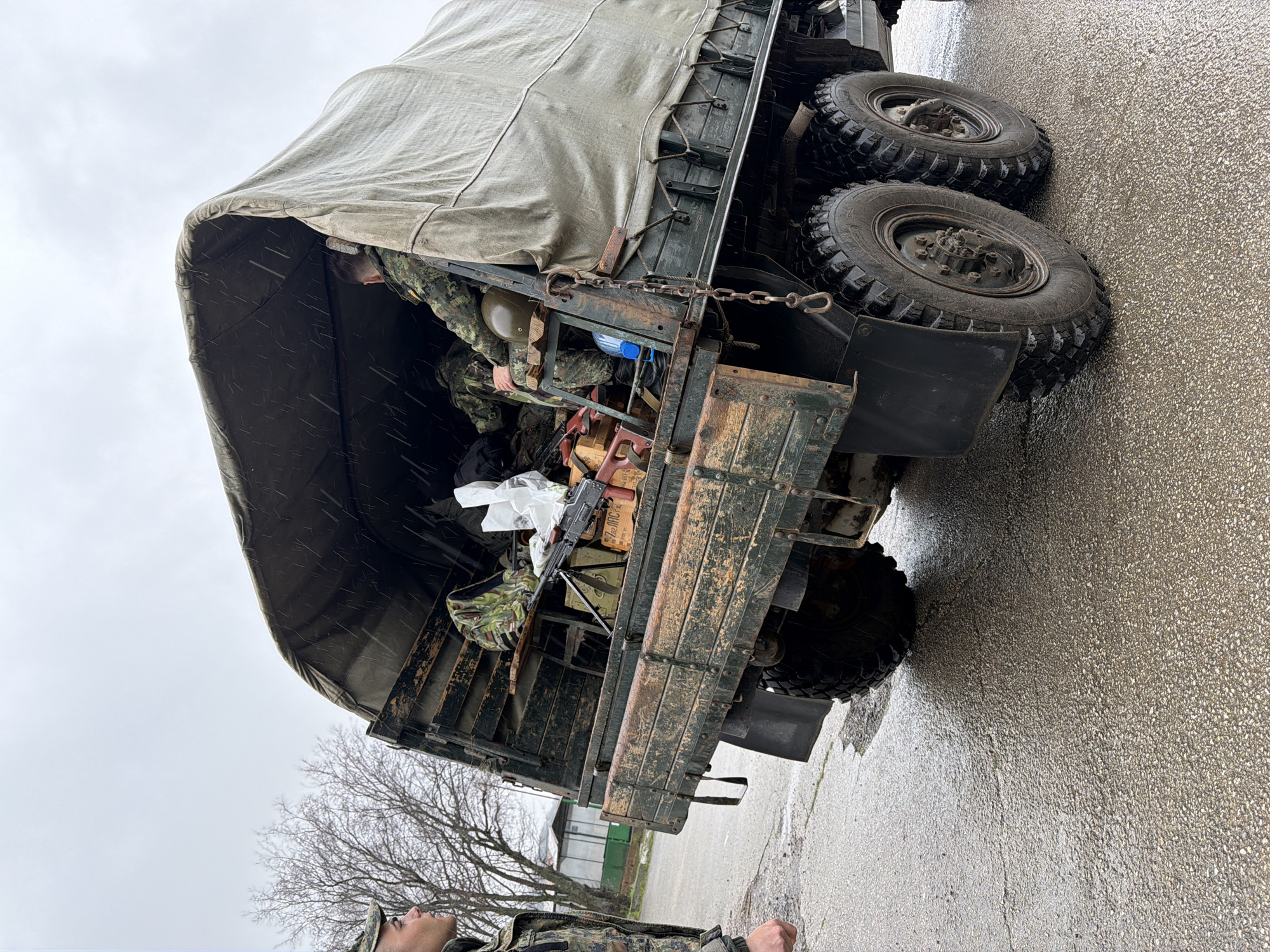 The image depicts an outdoor scene in Beliakovets, Bulgaria, under an overcast sky with visible precipitation, suggesting rain or sleet. A weathered, dark green military-style truck, featuring a canvas tarpaulin covering its cargo bed, is parked on a wet, cracked asphalt surface. The truck's rear has a dual-axle configuration with four robust, knobby tires. In the foreground, on the left, a male individual in camouflage fatigues and a matching cap is partially visible, facing towards the truck. His right arm is slightly bent. Inside the truck's cargo area, a second male individual, also in camouflage fatigues, is seated on a wooden plank, facing away from the viewer. A green military helmet is positioned beside him. The truck bed is loaded with equipment, including a rifle with a bipod resting atop wooden ammunition crates labeled "7,62 ЛПС" and "40-80". Additional items observed are camouflage backpacks, white plastic bags, and a blue container. A metal chain with a hook hangs from the rear right corner of the truck bed. The background shows bare trees and distant buildings, one with green architectural elements.