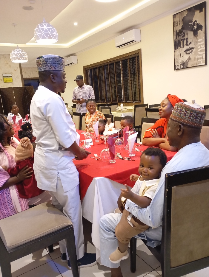 A group gathers around a red-clothed table in a brightly lit room. Three men wear patterned caps, while one holds a young child with tan pants and shoes. A woman in red attire sits next to them. Another man in a plaid shirt stands in the background. The room is decorated with modern light fixtures, air conditioning units, a window with blinds, and a framed art piece on the wall. Wine glasses and utensils are neatly arranged on the table.