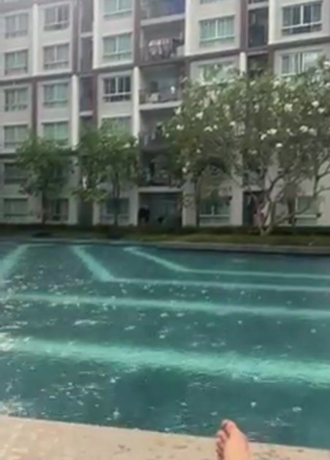 swimming pool in front of a tall apartment building. It is raining lightly. The pool is a light blue color, and the rain is causing ripples on the surface. There are trees planted between the pool and the building. A person is sitting with their feet dangling over the edge of the pool. The apartment building is several stories tall, with many windows and balconies.