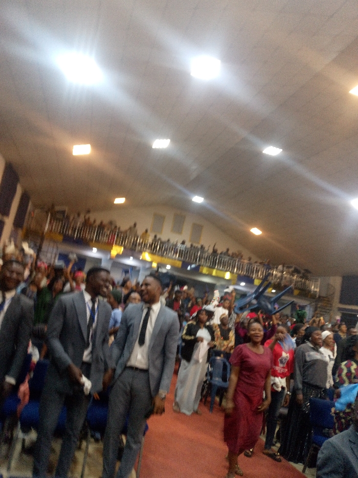 Inside a brightly lit auditorium, people are gathered. Three men in gray suits walk towards the camera on a red carpet. Others stand in the aisles or sit in blue chairs. A balcony in the background is lined with more people, many with their arms raised. The atmosphere appears joyful, with the light suggesting an open, spacious venue.