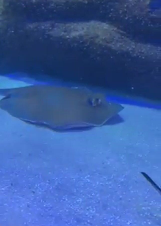 stingray swimming along the bottom of a large aquarium. The floor of the aquarium is covered in a layer of sand, and there are a few rocks at the back of the tank. The water is a clear, bright blue. The stingray is dark gray and flat, with a long, thin tail. It moves gracefully through the water, gliding along the bottom of the tank. There is some human voice audible in the background.