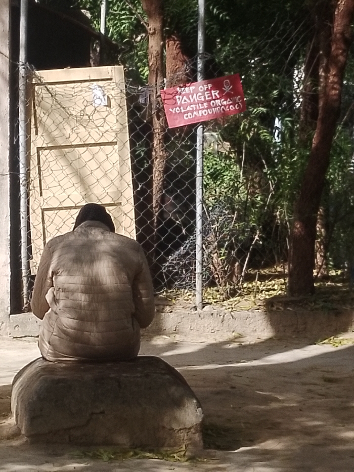 A person sits with their back to the camera on a large rock. Behind them is a chain-link fence with a red sign reading "KEEP OFF DANGER VOLATILE ORGANIC COMPOUNDS (VOC)." A wooden structure stands slightly askew near the fence. Trees and vegetation are visible in the background, suggesting an outdoor setting. The ground appears to be dirt or gravel. The lighting is bright, casting shadows on the ground and the rock. The person is wearing a jacket.