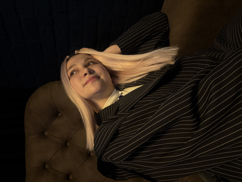 The scene depicts a young female, stated to be located in Saratov, Russia, seated indoors in a dimly lit environment. She possesses long, straight, light pink or blonde hair, parted centrally, and fair skin. Her head is tilted slightly upward and to the right, with her gaze directed upwards and to the right. Her left hand rests gently on the left side of her head. She exhibits a subtle, upward-curved smile, and her lips appear glossy. A small stud piercing is visible on her left nostril. She is wearing a dark, possibly navy or black, pinstriped blazer over a light-colored top, beneath which a pearl necklace with a small blue pendant is visible. She is seated in a brown, upholstered armchair featuring a tufted backrest. The background to her left consists of a dark, brick wall. Illumination highlights her face, hair, and the upper portion of the armchair, leaving much of the surrounding area in shadow.