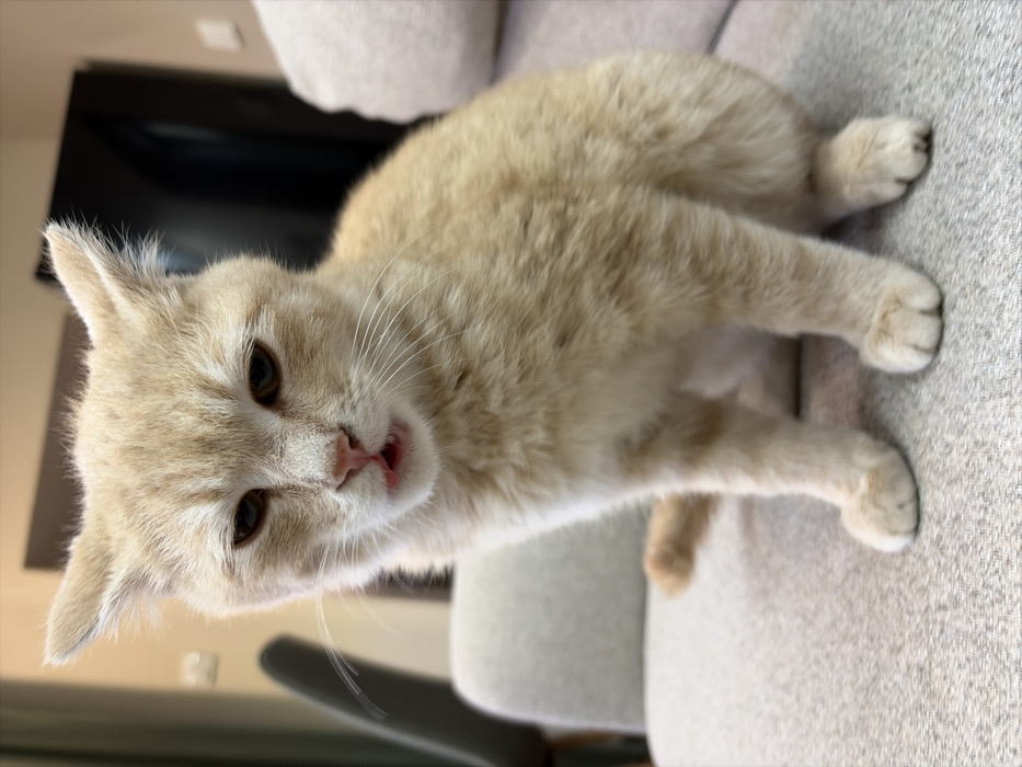 - "The scene depicts a light orange domestic cat sitting on a beige upholstered sofa or chair, located indoors in Skravena, Bulgaria" by FM-Agmuy2, licensed under CC BY 4.0
