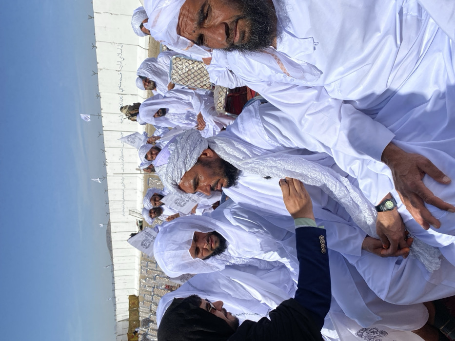 An outdoor scene in Mandisar, Afghanistan, depicts a gathering of numerous men under a clear blue sky