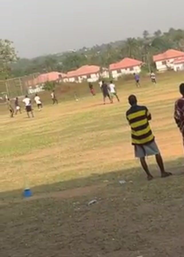 soccer game on a green field with spectators watching. The players are wearing different colored uniforms. There are buildings with red roofs in the background. The camera moves slightly, showing different parts of the field and the audience. There are trees and hills in the distance. Some spectators stand near the field's edge.
