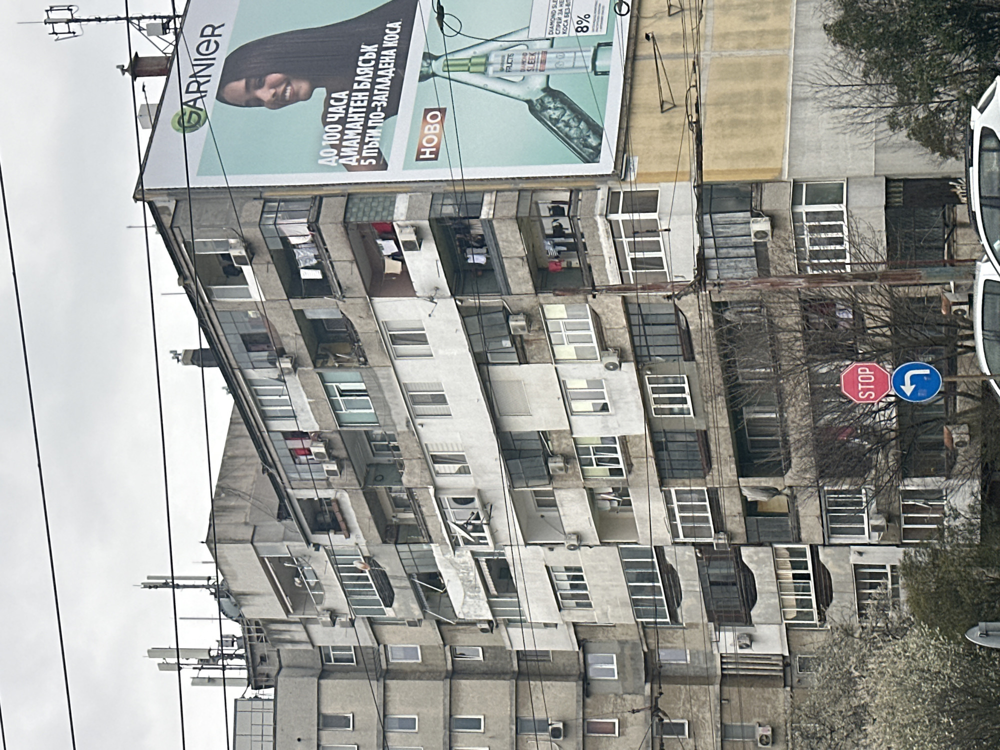 tall, multi-story, concrete apartment building in what is likely a densely populated area of Varna, Bulgaria. A large "GARNIER" advertisement banner is affixed to the top of the building. The building has numerous windows, some with air conditioning units, and balconies. Several are being used for drying laundry. There are multiple communications antennas on the roof. Street signs, including a "STOP" sign, are visible along the right edge. Power lines are strung in front of the building. A vehicle, likely a white van, is partially visible on the right. The sky is overcast.