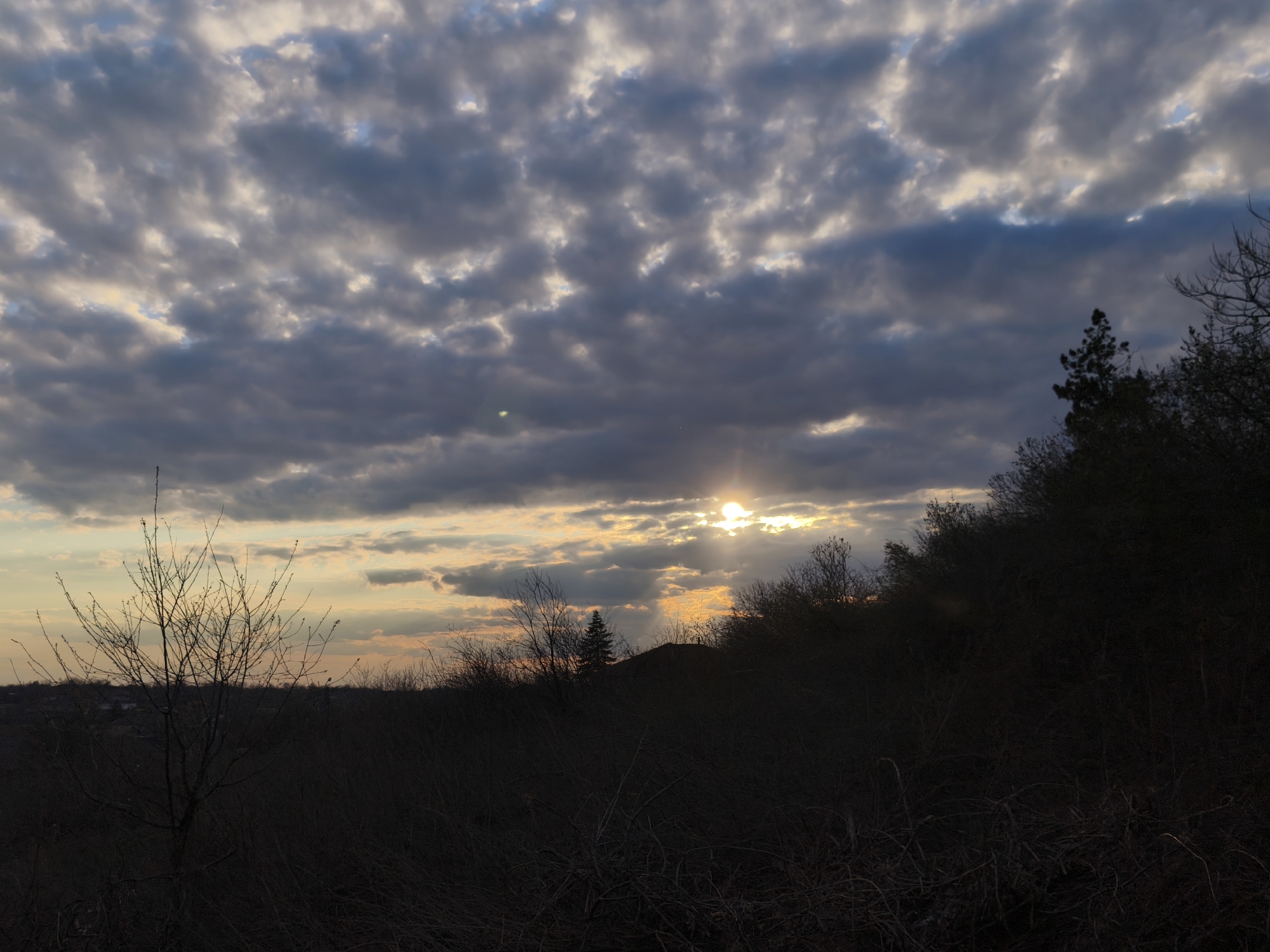 The image depicts a rural landscape at either dawn or dusk in Slavyanovo, Bulgaria. The sky occupies approximately two-thirds of the frame, filled with a dense array of dark grey and blue-grey altocumulus clouds. Patches of lighter, golden-orange sky are visible where sunlight penetrates the cloud cover, particularly towards the right side of the horizon where the sun is partially obscured by clouds. Bright golden-white rays emanate from the hidden sun, cutting through the cloud formations. The lower third of the image consists of a dark, silhouetted foreground and midground. On the left, a single, bare deciduous tree with numerous slender branches stands against the lighter horizon. Below it and extending into the mid-ground, the terrain is covered in low, dark, sparse vegetation. The right side of the frame features a dense, dark mass of silhouetted trees and bushes, including a distinct coniferous tree near the center-right. A faint, distant horizon line on the far left suggests the presence of very distant, low-rise structures or a small settlement. No individuals, animals, or specific actions are discernible.