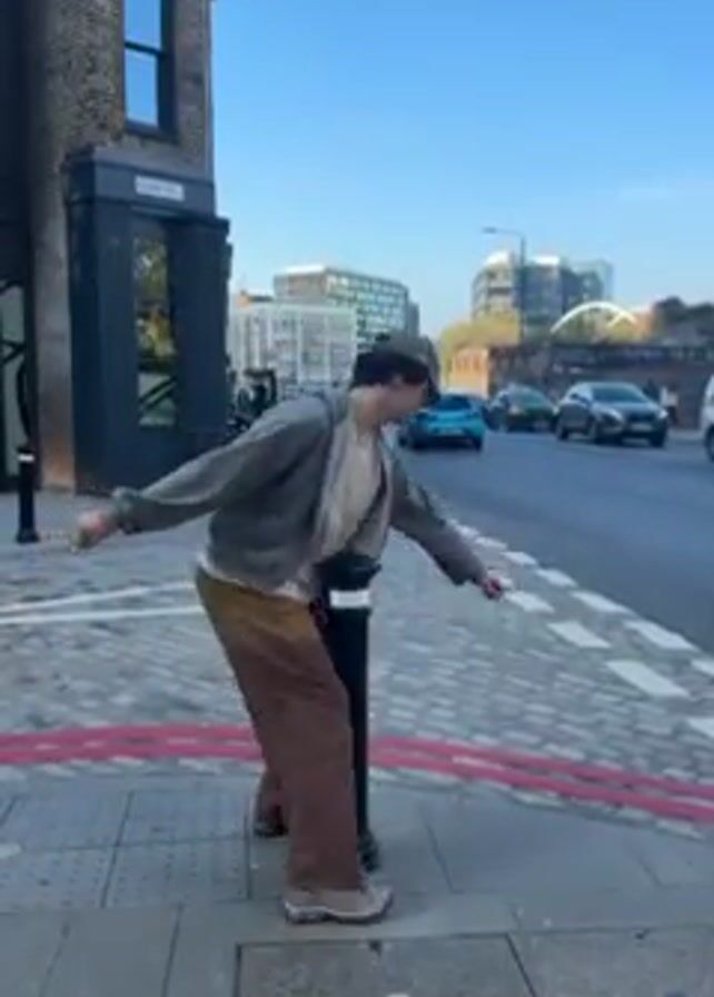 A person in a baseball cap, grey hooded jacket, beige t-shirt, and brown pants is seen outside. The person runs towards a black bollard, jumps onto it, tries to spin around the bollard, and falls backwards. After falling, the person briefly looks at the bollard, then walks away. There is street traffic in the background.