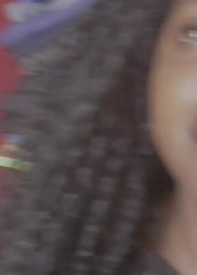 The video begins with a blurry shot of a room containing a blue chair, a shelf with various items, and a tiled floor with a faded pattern. The camera then transitions to a close-up of a smiling Black woman with braided hair, wearing a black lace top. She flashes a peace sign. Finally, the camera pans to show the interior of the room again, focusing on an open door leading outside. White tiles can be seen on the other side of the doorway and someone can be seen briefly walking past.