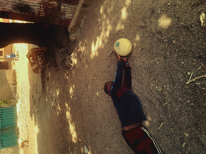 The scene depicts an unpaved, dusty outdoor area in Akwanga, Nigeria, under bright daylight. In the foreground, a child, appearing to be male, lies prone on the dark brown, pebbly ground. The child is dressed in a dark blue long-sleeved top with red accents on the shoulders and sleeves, and dark trousers with a red patterned design and white vertical stripes. Both hands are extended forward, clutching a light-colored, spherical object identified as a ball, which features a green patch and appears somewhat deflated. The child's head is turned towards the viewer. To the left in the midground, a light-colored animal, possibly a goat, is partially visible, positioned on the ground, seemingly grazing or sniffing. Behind this animal, a building constructed of grey concrete blocks is visible, fronted by a large, teal-colored metal gate. To the right, a large tree trunk with prominent exposed roots borders the scene. Adjacent to the tree's base, a broken wooden chair or stool lies on its side. Further back, a section of a building with rusted corrugated metal siding is discernible. In the far background, another individual, likely a young person, stands near a building, dressed in a white top and dark lower garment, facing towards the left side of the frame. The ground is dry earth with scattered debris and patches of shade cast by the overhead tree.