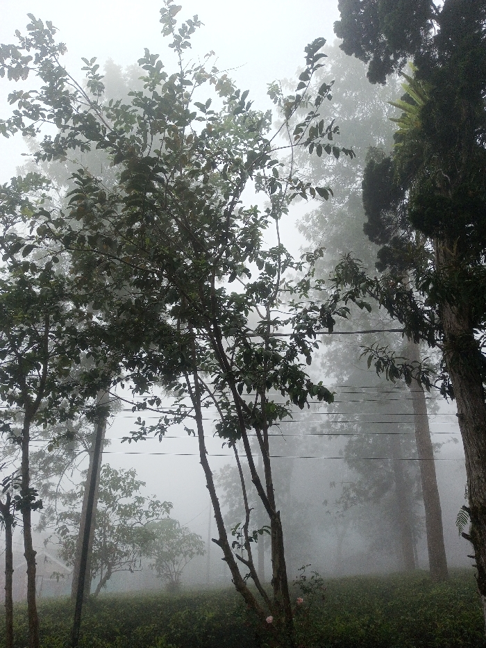 A foggy landscape featuring trees, most prominently in the foreground. The trees have dense, green leaves and slender trunks. Dense fog obscures the background, giving the image a mysterious and ethereal quality. A hint of green vegetation is seen on the ground. A power line stretches across the scene, adding an element of human presence in the otherwise natural setting.