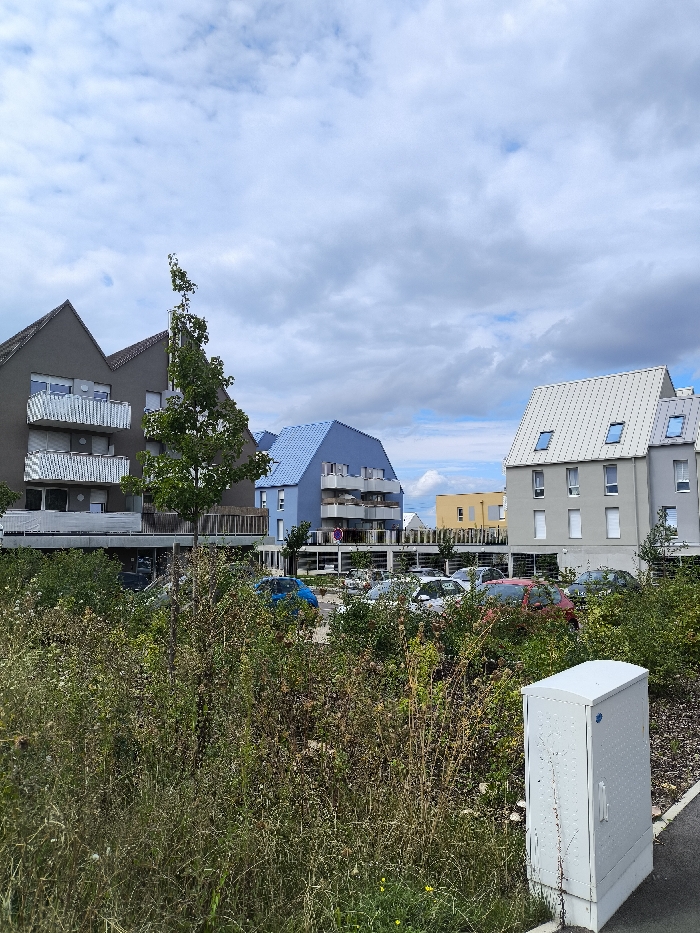 The image depicts a modern urban landscape in Wolfisheim, France, under a partly cloudy sky. In the foreground, a substantial area of unkempt, wild vegetation, primarily green and brown foliage, occupies the lower left and central portions of the frame. A white utility cabinet with a textured surface and a small blue circular emblem on its upper right side is positioned on a dark gray paved path in the lower right corner. Behind the foreground vegetation, a paved parking lot is visible, containing multiple parked passenger vehicles of various colors, including a blue car, several white cars, and a red car. A brown, circular regulatory sign is present within the parking area. The background features several multi-story buildings. On the left, a dark gray building with a distinct irregular peaked roofline and multiple balconies with white railings is prominent. A tall, slender tree with green leaves stands in front of this building. To the right of the dark gray structure, a bright blue building with a similar peaked roof and balconies is visible. Further to the right, a light gray building features a white, horizontally ribbed metal roof punctuated by multiple skylight windows. A yellow-colored building is partially visible in the far background between the blue and light gray structures. The sky overhead is largely covered by white and light gray clouds, with patches of lighter blue showing through. No people are present, and no actions or interactions are depicted.