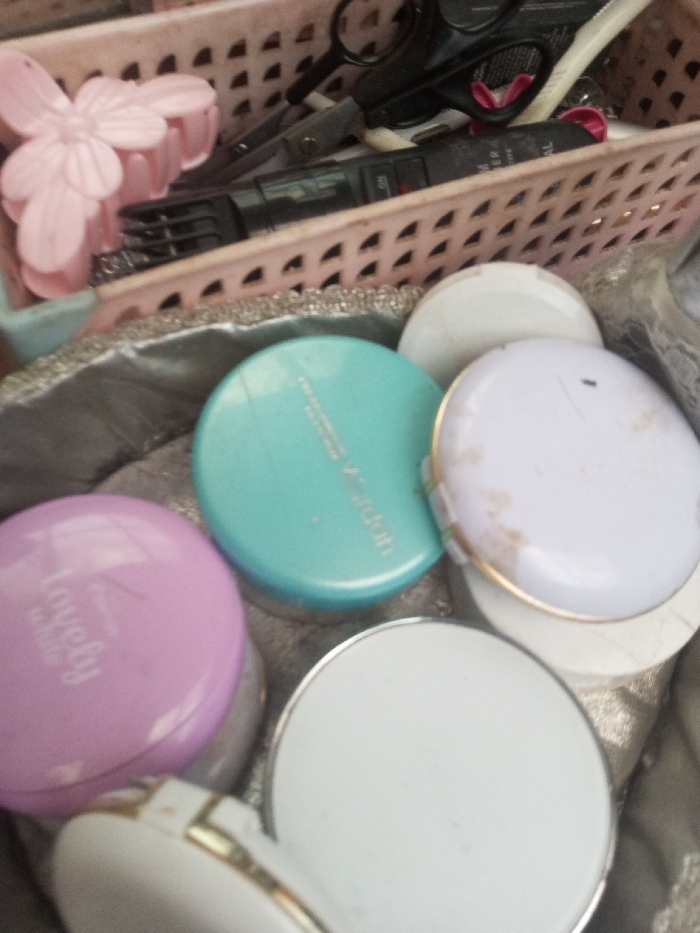 - "Several cosmetic compacts in pink, turquoise, and white with gold accents are scattered inside a silver-colored bag" by FM-Z7eLi1, licensed under CC BY 4.0