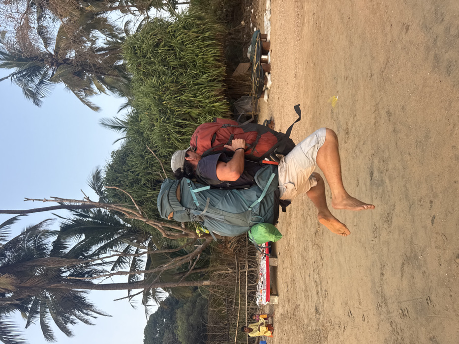 The image displays a barefoot male individual captured mid-air, jumping on a sandy beach in Gokarna, India. He wears a grey baseball cap, a dark t-shirt, and light-colored cargo shorts, carrying a large teal-grey backpack on his back and a smaller red backpack on his chest. A small green item is attached to the bottom of the teal backpack. His knees are bent, and his head is turned to his right. In the left background, two individuals, one in a yellow garment and one in a red garment, sit on the sand beside a low makeshift vendor stall displaying various items. Behind them, a fence constructed from branches and dense tropical vegetation, including numerous palm trees and thick green bushes, lines the shoreline. Further right, covered mounds and barrels are visible on the sand near the vegetation. The sky above is clear and light blue.