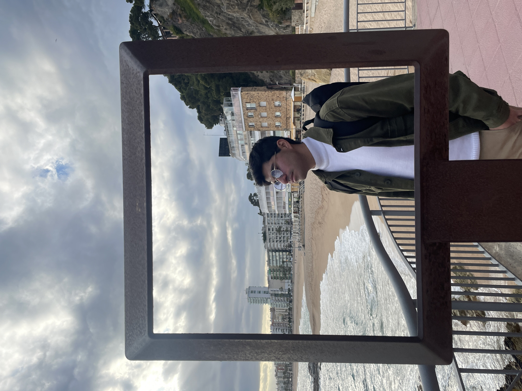 The image depicts a young adult male positioned within a large, rectangular, dark brown metal frame on a promenade overlooking Platja de Lloret (Lloret Beach) in Lloret de Mar, Spain. The male, appearing to be in his 20s, stands in profile facing left, his gaze directed towards the horizon. He wears a white turtleneck sweater, an olive green button-up jacket, light brown pants, and round, light-framed sunglasses, with a black backpack on his right shoulder. Behind the man, the sandy beach curves along the coastline, meeting the Mediterranean Sea where moderate waves break. In the mid-ground, a series of multi-story buildings, including hotels and residential structures, lines the beachfront. A prominent tall, slender white building is visible on the far left, while a stone-clad building with brown shutters stands closer to the right. To the far right, a steep, rocky cliff face covered with dense green vegetation and pine trees rises. The sky above is heavily overcast with grey and white clouds, showing intermittent lighter patches. In the immediate foreground, a grey metal railing with horizontal bars and vertical spindles is partially visible behind and to the left of the frame. Red-brown tiled paving is discernible at the bottom right. The overall scene suggests a coastal tourist area on an overcast day.