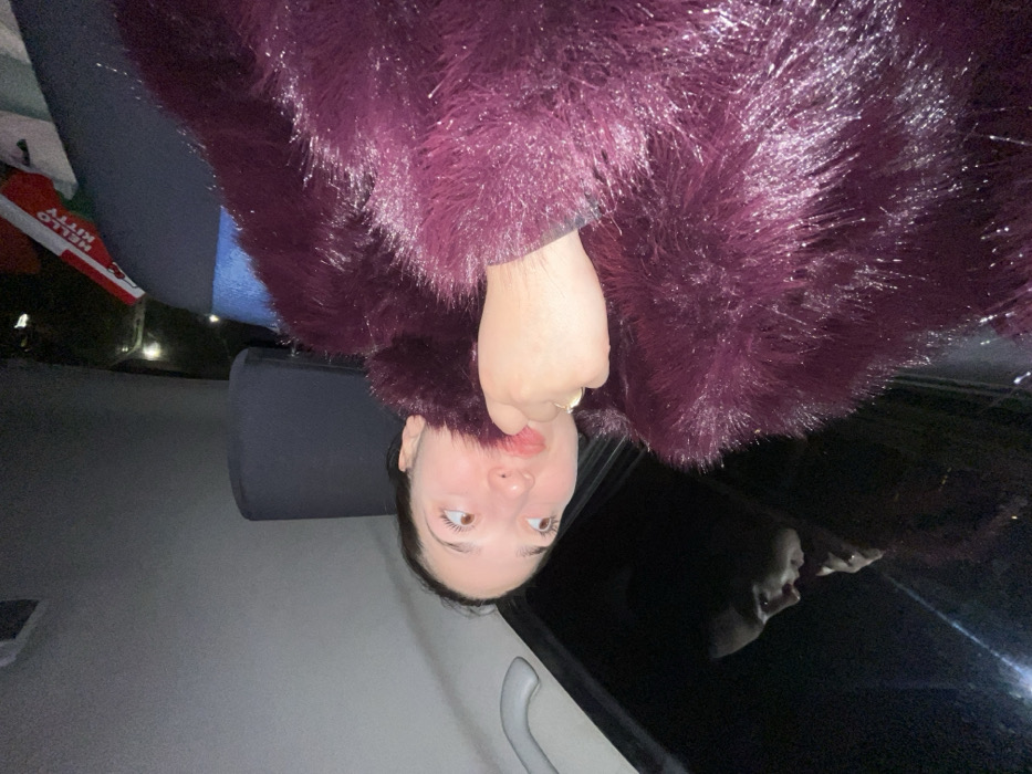 A woman, seen upside down, wears a large, fuzzy, deep purple jacket. Her face is visible, showing her eyes looking slightly to the side. She's inside a car; a headrest and part of the interior are visible. The car's window reflects a distorted image of her. Part of a Hello Kitty box is visible in the blurry background.