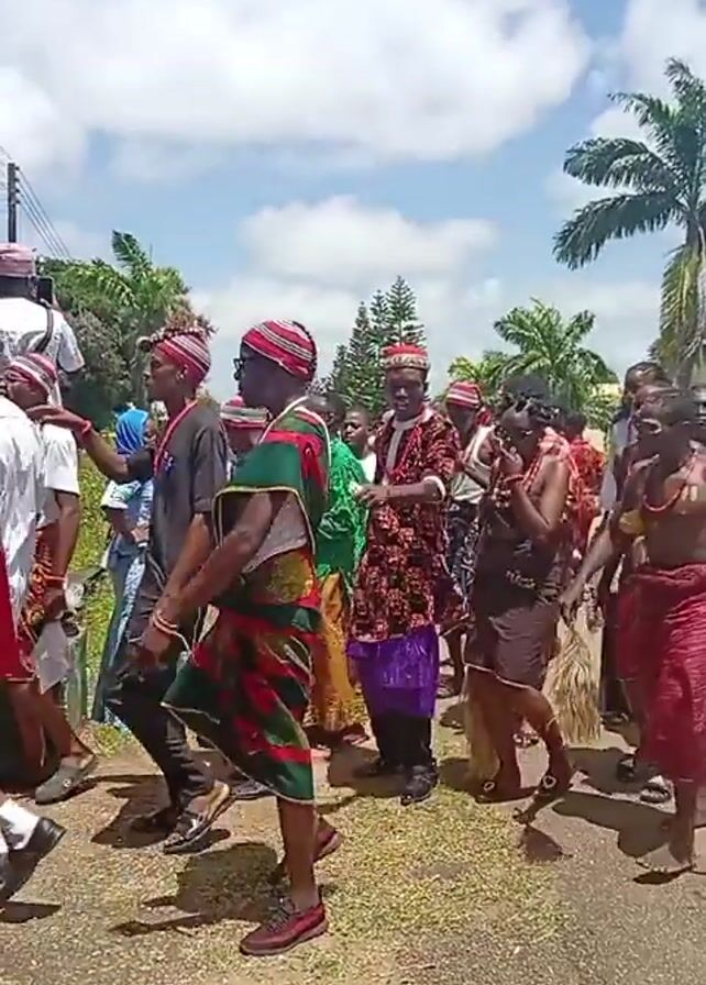 group of people walking, likely in a procession, outdoors on a sunny day. The group includes men and women, some dressed in traditional African clothing with distinctive colors and patterns, while others wear more casual attire. The clothing includes red, green, and black fabrics. Some participants carry items like fans made of straw or wooden sticks. The group moves together on a dirt road or path. In the background, trees, including palm trees, and the sky with scattered clouds can be seen. The atmosphere appears to be celebratory or cultural.