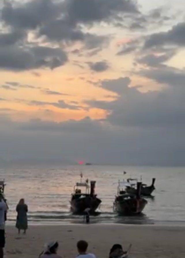 beach scene at sunset. Two traditional longtail boats are partially submerged in the shallow water near the shore. People are scattered along the beach; a couple sits on the sand in the foreground, while others stand or walk nearby. The sky is filled with gray clouds illuminated by the fading sunlight, with a red glow visible on the horizon where the sun is setting.