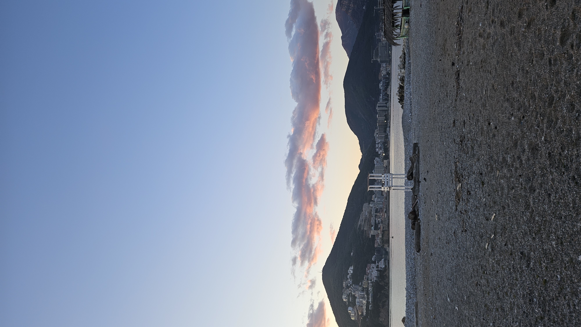 A beach scene in Budva, Montenegro, is depicted in a landscape-oriented image. The sky is a gradient of light blue, transitioning towards a soft orange-pink hue near the horizon, where elongated, illuminated clouds stretch vertically. Adjacent to the sky is a dark, silhouetted mountain range interspersed with buildings of varying heights, indicating urban development along the mountainside. A stretch of water separates the mountain and the beach. On the beach is a set of white lifeguard chairs next to pieces of driftwood. The foreground is dominated by a sandy beach, its texture rough and uneven. The lighting suggests a time near sunrise or sunset, casting a warm glow across the scene.