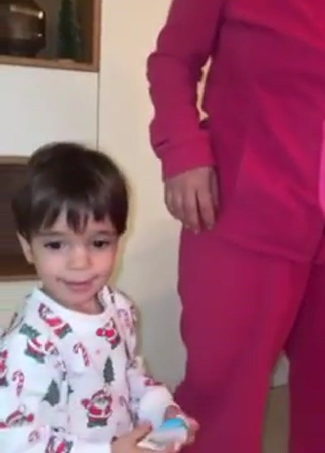 A toddler with brown hair wearing a white sweatshirt with a pattern of Santa Claus and Christmas trees is holding a white and blue object and running in a home. A person in a pink sweatsuit is standing nearby. The home has white cabinets and tiled floors.