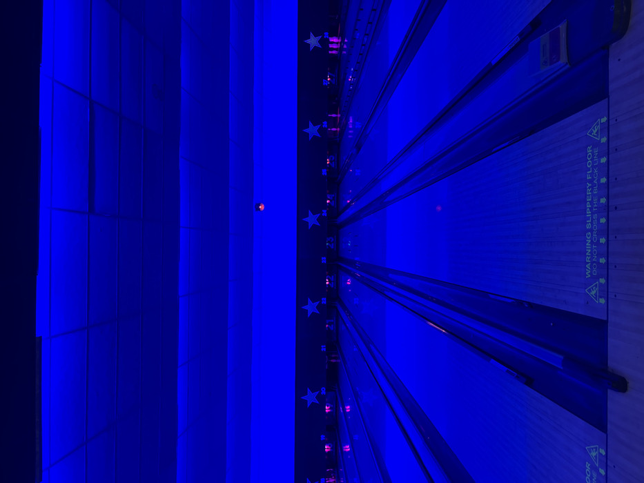 n empty bowling alley in Bradford, UK, located at latitude 53.791, longitude -1.747. The bowling lanes are illuminated with bright blue lights. The ceiling has a grid pattern and is also lit with blue lights. There are five stars on the back wall, which are also illuminated with blue light. The image shows a close-up of the bowling lanes with a "WARNING SLIPPERY FLOOR DO NOT CROSS THE BLACK LINE" sign at the bottom of the frame. There are no people present in the image.
