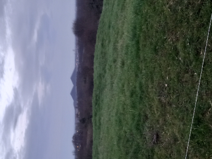 A landscape features a grassy field on the right side, extending into the distance. Beyond the field, a treeline with some buildings and faint lights can be seen. Further in the background, two distinct pyramidal hills or peaks are visible. The sky is overcast and cloudy. A thin, white line diagonally crosses the foreground of the field.