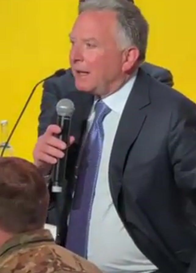 man in a dark suit speaking into a microphone at a conference or meeting. The man is middle-aged with graying hair and wearing a blue tie. He is standing at a table with a yellow backdrop with writing on it. There are other people at the table behind him. In front of him, a person in camouflage is partially visible, along with other attendees. There are bottles of green liquid on the table in front of the speaker. The man is gesturing with his hands as he speaks.