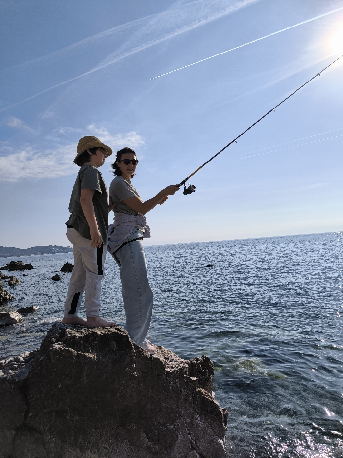 This image depicts two individuals on a dark, craggy rock formation at the edge of the Adriatic Sea in Bar, Montenegro. On the left, a youth, barefoot, wears a straw hat, an olive green short-sleeve shirt, and grey sweatpants with black accents, looking towards the right. To their right, an adult female, wearing dark sunglasses, an olive green short-sleeve shirt, and light-wash wide-leg jeans, holds a fishing rod angled over the water. A light-colored sweatshirt is tied around her waist, and she wears light-colored footwear. The sea is calm with minor surface ripples, extending towards a distant, vegetated coastline on the left horizon. The sky is clear blue, marked by several distinct white aircraft contrails, and a bright solar glare is visible in the upper right quadrant. The scene occurs on a sunny day with clear weather.