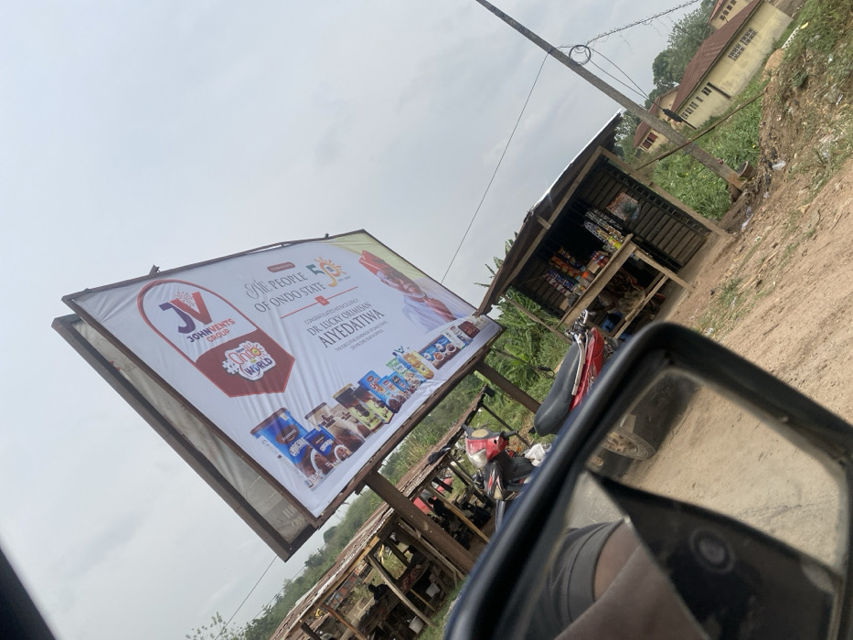 The image depicts a roadside scene in Owo, Ondo State, Nigeria, captured from inside a vehicle, evidenced by a partial view of a black-framed side mirror and a dark-clad leg in the immediate foreground. A large billboard, mounted on wooden posts, dominates the center, featuring "JOHNVENTS GROUP" and "ONDO WORLD" branding, various product images, and a congratulatory message from "THE PEOPLE OF ONDO STATE" to "DR. LUCKY OLUSAN AIYEDATIWA" with his portrait. To the left of the billboard, several dilapidated wooden market stalls with corrugated metal roofs are visible, one containing a dark figure. A red and black motorcycle is parked on the dirt path below the billboard. To the right, a small, open-fronted wooden kiosk with a sloped roof displays various packaged goods for sale. A tall utility pole with wires stands further right. The ground is a dirt surface. In the background, green vegetation is dense, and a light-colored building with a dark roof is partially visible. The sky is overcast.