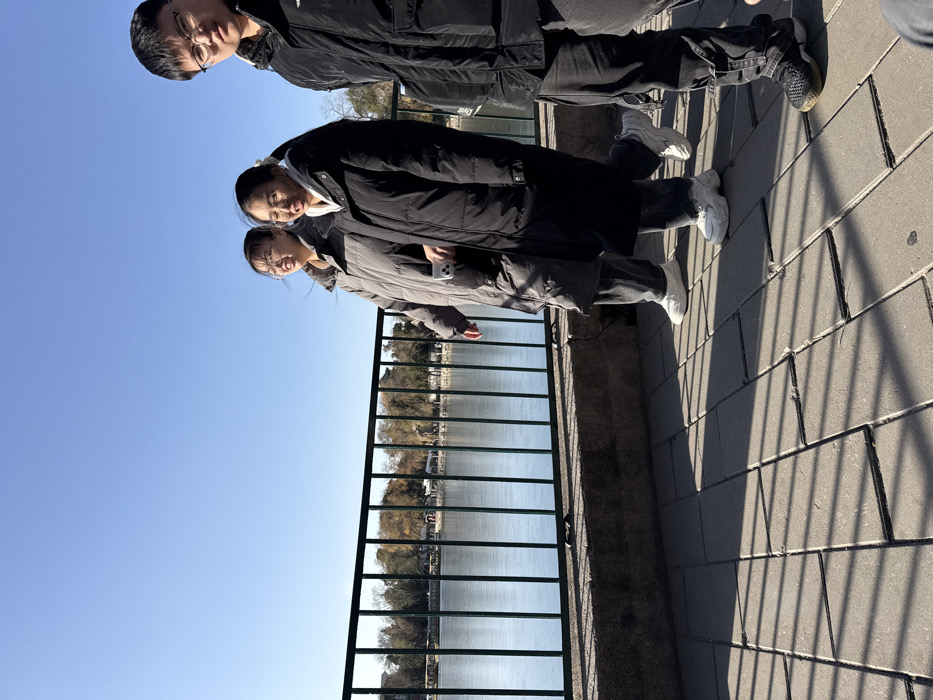 Three people stand on a paved walkway next to a metal railing. Beyond the railing, there is a body of water and trees. The people are wearing winter coats. The sky is blue. The photo is rotated so that the sky is on the left. The walkway has shadows cast on it.