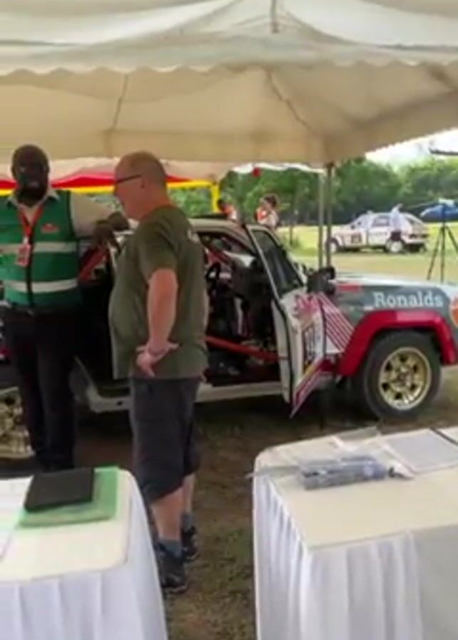 two men standing next to a rally car under a white tent. The man on the left is Black and wearing a green vest, black pants, and a badge. The man on the right is white, wearing a green shirt, dark shorts, and glasses. The rally car is red, white, and grey with gold wheels and the name "Ronalds" written on the side. There are tables covered with white tablecloths in front of the car, with papers and pens on them. In the background, there are other cars, people, and a helicopter. The environment appears to be a grassy field. The two men appear to be talking, possibly discussing the car or the rally event.
