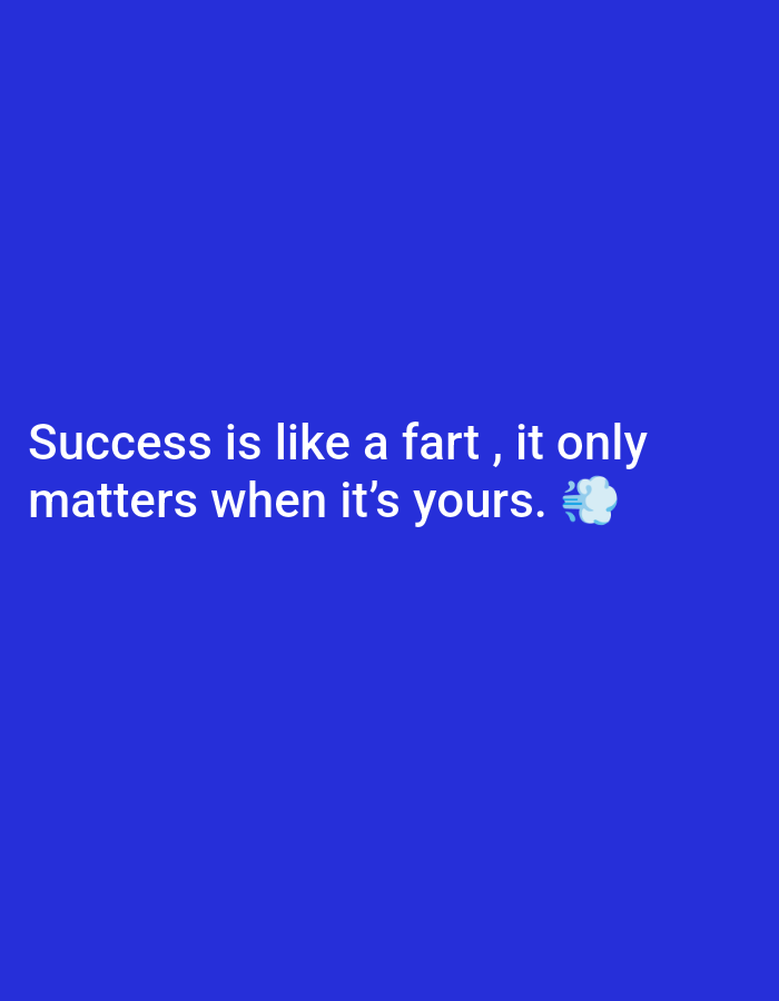 The image, observed in Falomo, Nigeria, presents a digital graphic on a solid royal blue background. Centered horizontally and occupying the lower half, white sans-serif text reads: "Success is like a fart , it only matters when it's yours." The sentence concludes with a light blue and white "💨" (puff of smoke) emoji. No people, discernible physical objects, or environmental features are depicted. The scene is purely textual and emblematic against a monochromatic digital field.