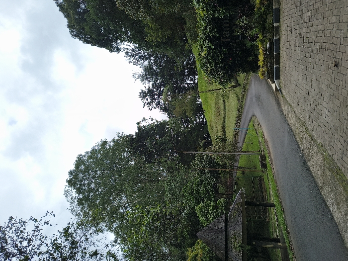 A winding asphalt path cuts through lush greenery. The path borders a brick walkway and slopes upwards, bordered by a grassy hill. A traditional gazebo sits nestled amidst the foliage. The sky is overcast with cloudy patches visible through the tall trees.