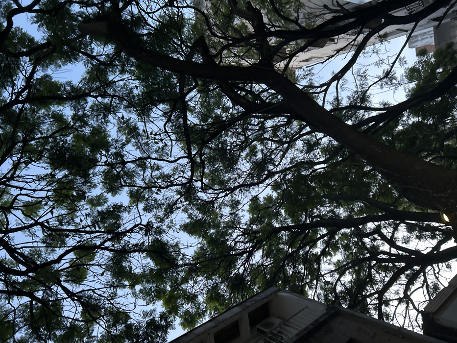 Looking upwards, the image captures a dense canopy of tree branches and leaves against a pale blue sky